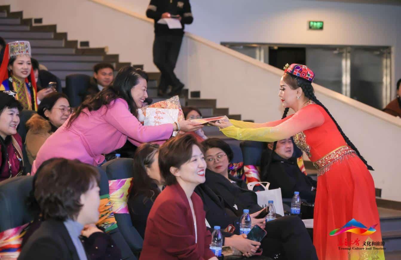 推介活动中,乌鲁木齐文旅资源推介人通过生动的语言以及精彩的宣传片带领大家了解了乌鲁木齐这座城市的独特魅力和无限活力以及 优质的冰雪旅游资源,让大家领略“夏季草原牧歌、冬季冰雪狂欢”的季节反差之美;搭配新疆手工艺品展陈,让嘉宾沉浸式感受多元文化交融的鲜活气息。